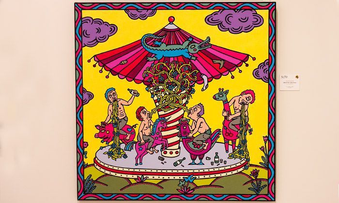 Разные цвета, разные жанры, форматы, материалы и настроения. Молодость, дерзость, фантазия на тему Тайгера Вудса, мудрость, видения, мрачные и светлые краски. Картины могут казаться простыми и понятными, милыми, странными и сложными. Легкими и яркими. Могут напоминать современную поп-культуру, а могут ее пародировать. Могут напоминать и классическое в широком понимании искусство, по определению таковым не являясь.
