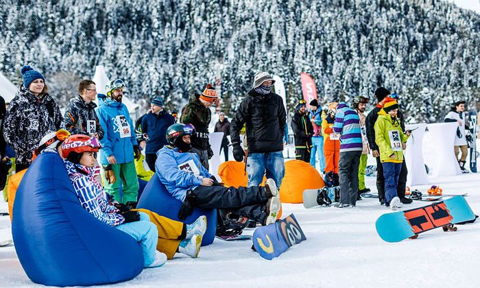 Приехав на место, мы отправились на звуки музыки. На площадке, где развернулся музыкальный open-air, ведущий со сцены объявлял о начале регистрации спортсменов. Здесь же организаторы устроили зимний чиллаут со столиками и пуфами, на которых отдыхали райдеры и туристы. Гостей в течение дня развлекали музыкой и конкурсами. Болельщикам и участникам в зоне фудкорта раздавали бесплатные угощения.